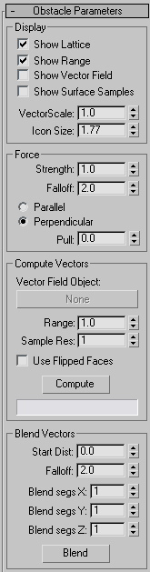 A vector field, generated around an obstacle object, allows crowd members to avoid that object in a scene. The field consists of a three-dimensional array of vectors which guide delegates or other objects around the obstacle. The settings in this rollout help determine how the vectors are generated and displayed, and how they affect other objects.