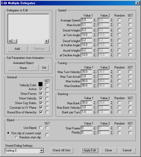Tip: To reset a parameter to a specific value for all delegates in a group after it's been set to a random value within a range, turn off Random and turn on SET for the parameter, then set Value1 to the desired value, and then click OK.
