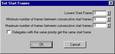 This dialog assigns start frames to the delegates selected via the Delegates To Prioritize control. In general, you should first use a non-random method to assign priorities in the Priority rollout, such as the Pick/Assign button or one of the Proximity options, and then assign start frames with this dialog. You can use the dialog to set a start frame for the highest-priority delegate (that is, the delegate with the lowest Priority setting), and then have start frames incremented randomly between two limits for the remaining delegates, based on priority order.