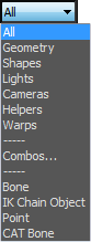 The Selection Filter list lets you restrict to specific types and combinations of objects that can be selected by the selection tools. For example, if you choose Cameras, you can select only cameras with the selection tools. Other objects do not respond. When you need to select objects of a certain type, this is useful as a quick method of freezing all other objects.