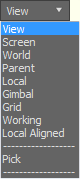 The Reference Coordinate System list lets you specify the coordinate system used for a transformation (Move, Rotate, and Scale). Options include View, Screen, World, Parent, Local, Gimbal, Grid, Working, and Pick.