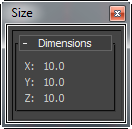 Opens a small, non-modal dialog that shows the dimensions of the selected object’s bounding box on all three axes. If you change the size, the displayed values update automatically.