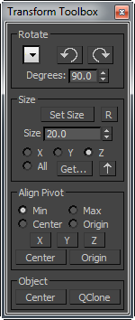 The Transform Toolbox contains functions for easy object rotation, scaling, and positioning as well as for moving object pivots.