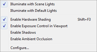 Shows a submenu with options for lighting and shadow previews in viewports. For more information, see below.