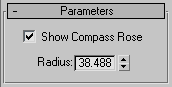 Compass displays as a non-rendering compass rose, with indicators for North, South, East, and West. A compass is part of a Daylight or Sunlight system; you create a compass automatically when you create sunlight. In a Sunlight system, the orientation of the compass indicates the orientation of the scene, relative to the path of the sun (the ecliptic).
