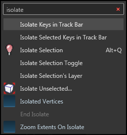 As you enter a string, the dialog displays a list of actions whose name contains the text you've entered so far. Choosing an action from this list applies the action (provided that it is valid for the current state of the scene), and then the dialog disappears.