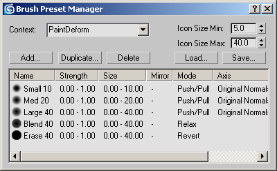 To rename a button preset, double-click its name and then edit or enter a new one. Other settings are available from the applicable rollout and the Painter Options dialog. For example, you can set the brush strength and size on the applicable rollout, but to set the range, which is used by a pressure-sensitive input device such as a pen and tablet, you must use the Painter Options dialog. Mirror options are also available only from this dialog.