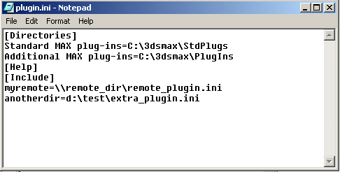 The next time you start 3ds Max, it will load plug-ins from the directories defined in plugin.ini as well as plug-ins in any remote INI file specified in plugin.ini.