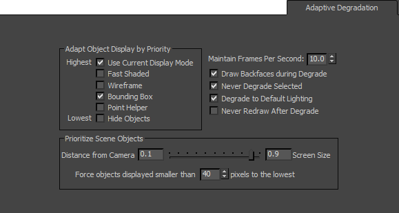 Lets you set the frame rate in frames per second that adaptive display will attempt to maintain. If the frame rate drops below this, 3ds Max will increase the amount of degradation based on the other settings on this panel. Default=10.0.