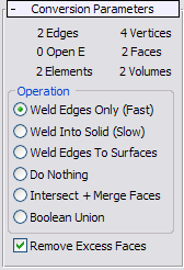 - Weld Edges Only Welds edges of adjoining surfaces (removing the seams or gaps), making them into a single surface. This option does not attempt to determine whether the object is a solid. This often suffices for rendering or combining objects that do not form a closed solid.