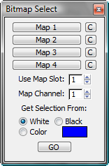 With Bitmap Select you can select sub-objects in the model based on a bitmap image. Bitmap Select applies the chosen bitmap for selection purposes based on the model’s UVW mapping (it need not be part of a material applied to the object), and uses it to select parts of the mesh that correspond to a defined color. For example, you can select all polygons that have the color white in the chosen bitmap.