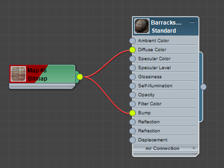 To map a material component, you wire a map node to the input socket for that component’s slot. Drag from the map socket to the material socket or from the material socket to the map socket.