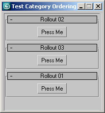 rollout rollout01 "Rollout 01" category:10 ( button btn_pressme "Press Me" ) rollout rollout02 "Rollout 02" category:1 ( button btn_pressme "Press Me" ) rollout rollout03 "Rollout 03" category:2 ( button btn_pressme "Press Me" ) theFloater = newRolloutFloater "Test" 200 200 addRollout rollout01 theFloater addRollout rollout02 theFloater addRollout rollout03 theFloater |