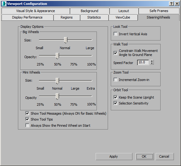 The SteeringWheelsOps Interface exposes the Steering Wheels viewport navigation feature's settings to MAXScript.
