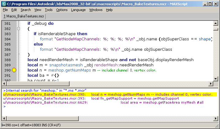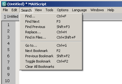 The Search menu o f the Tabbed MAXScript Editor introduced in 3ds Max 2008 contains commands for searching and replacing text, jumping to line, offset or bookmark and managing bookmarks.