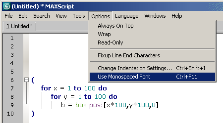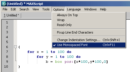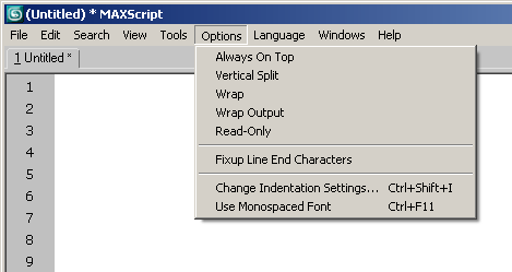 The Options menu of the Tabbed MAXScript Editor introduced in 3ds Max 2008 contains options to control various behaviors of the Editor as well as commands for fixing line end characters, changing indentation settings and switching between proportional and monospaced font dispaly.