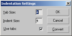 Convert- press this button to convert tabs to spaces in the beginning of a line when Use Tabs is unchecked and spaces to tabs when Use Tabs is checked.