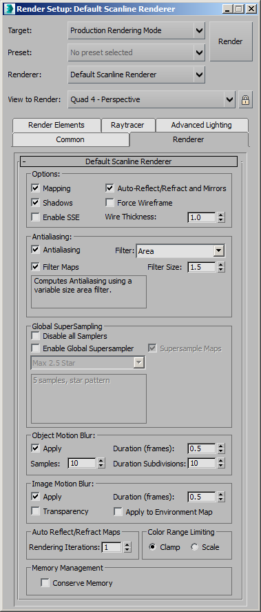 This class represents the Default Scanline Renderer. It lets you construct an instance of the Default_Scanlinle_Renderer class to be assigned to the Current, Production, ActiveShade, and Material Editor renderers using the renderers structure.