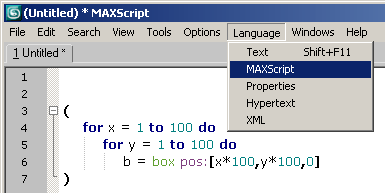 The Language menu of the Tabbed MAXScript Editor introduced in 3ds Max 2008 contains commands for switching the syntax coloring between the currently installed modes: