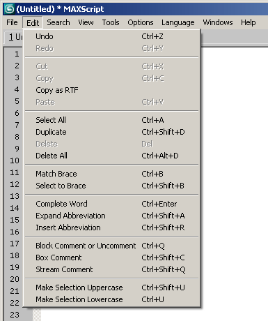 The Edit menu of the Tabbed MAXScript Editor introduced in 3ds Max 2008 contains commands for undoing/redoing changes, copying, deleting and selecting text, as well as tools for bracket-matching, auto-completing words, commenting and case-changing.