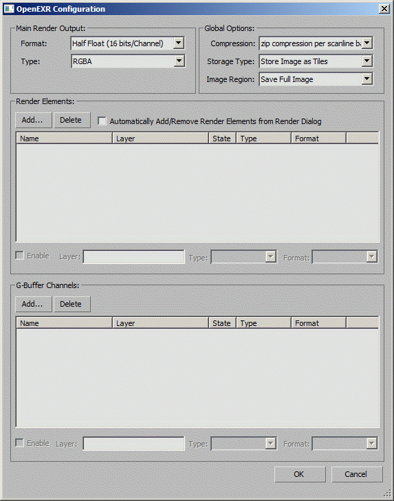 Adds a render element layer. You must specify the (3ds Max) name, output (EXR) name, type, and format.