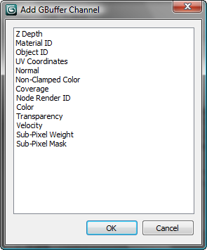 Note: The Material ID and Object ID channels are channels you set up in the scene itself. Other G-buffer channels are generated automatically, based on the scene geometry, animation, and rendering settings.