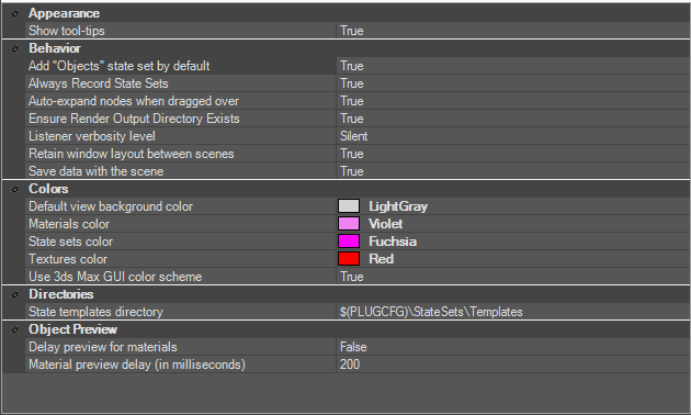 Options on this panel are for the overall appearance and behavior of the State Sets dialog.