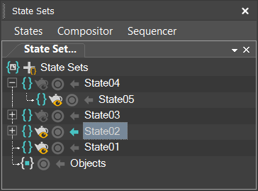 The State Sets dialog contains three main menus: States, Compositor, and Sequencer, plus their corresponding panels. Each panel also contains a number of right-click menus whose contents depend on the context.