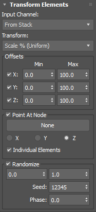 This operator requires an existing vertex selection before it can affect any elements in the mesh. When the Transform Elements operator does not appear to be doing anything, it is often because there is no selection on which to operate. You can provide a vertex selection with a manual soft selection (for example, using an Edit Poly) or via the operator stack (for example, using a Node Influence operator).