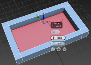 - Go to the Polygon sub-object level, select the inside polygon on the top of the box, and extrude it inward about 10 units. Exit Extrude mode.
