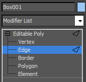 - In the modifier stack, click the + icon next to the Editable Poly entry to expand the sub-object hierarchy, then click the Edge item to activate the Edge sub-object level.