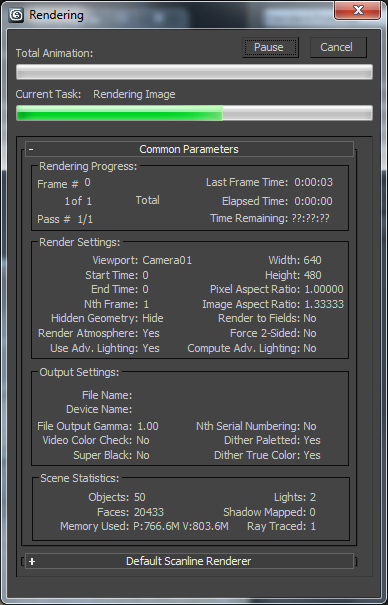 The next time you render, the Rendering Progress dialog appears appear on-screen.