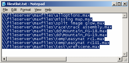 The second line of the batch file (dir) writes out the list of files to fileslist.txt (see the image below). This text file is used as the tasklist. In the cmdjob line, the –taskname parameter has the value 1, which means that each task will get its taskname from the first column of the taskfile. The %tp1 parameter specified after “3dsmax.exe” tells the cmdjob plugin to use task parameter 1 (column 1) from the tasklist as an argument to pass to 3dsmax.exe.