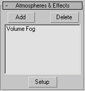 Atmospheres & Effects rollout, click Add. This displays the Add Atmosphere dialog. This creates a duplicate atmosphere for the apparatus. Its settings are initially identical to the atmosphere you chose. You can adjust them using Setup.