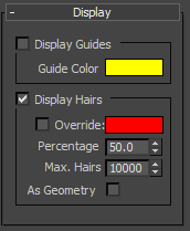 These settings let you control how hairs and guides display in the viewports. By default, Hair displays a small percentage of the hairs as lines. Alternatively, you can display the hairs as geometry, and you can also choose to display the guides.
