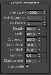 This rollout lets you set the hair count and density, the length, thickness at the root and tip, and various other comprehensive parameters.