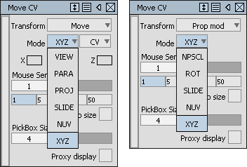 The left mode menu appears only if Transform is set to Move or Prop mod.