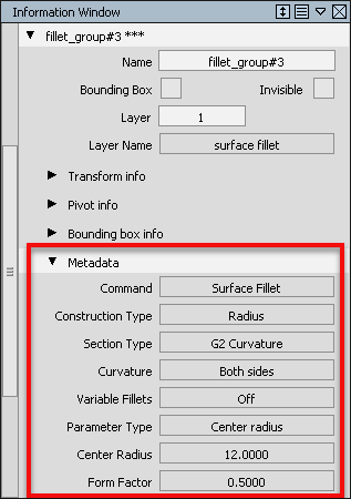 The Creation tab in the Information Window has been renamed to Metadata. Now, when you select an object with metadata, you can view this information in the Metadata tab of the Information Window.