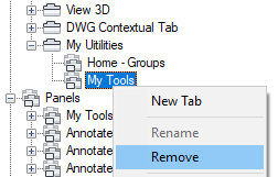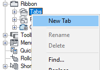 A new ribbon tab (named New Tab) is placed at the bottom of the Tabs node.