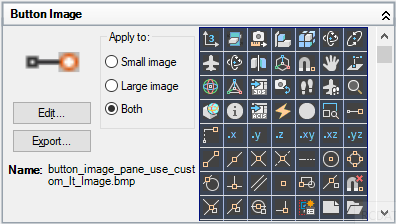 In the Button Image pane, under Apply To, select one of the three image assignment options; Small Image, Large Image, or Both. Then select the image you imported from the image list.