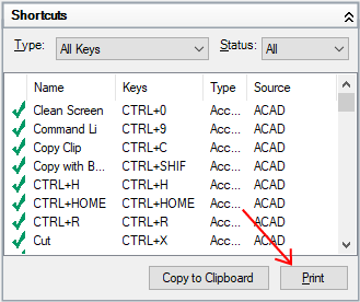 - In the Shortcuts pane, filter the type and status for the keyboard shortcuts to print.