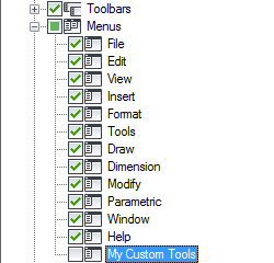 Use the CUI Editor to control the display of the Quick Access toolbar, ribbon tabs and panels, tool palettes, toolbars, and pull-down menus.