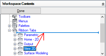 - In the Workspace Contents pane, click the plus sign (+) next to the Ribbon Tabs node to expand it.