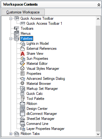 - In the Workspace Contents pane, click the plus sign (+) next to the Palettes node to expand it.