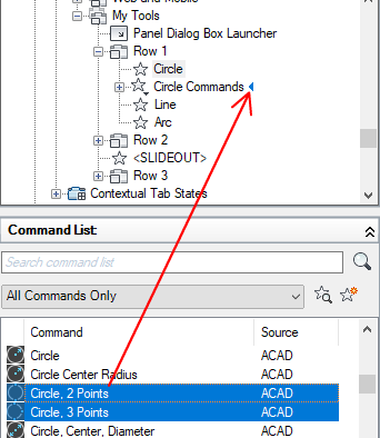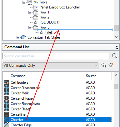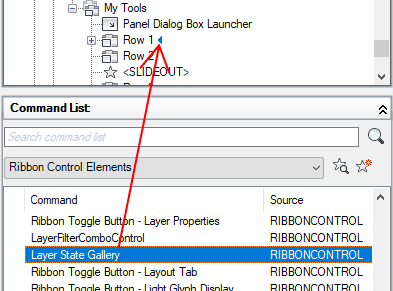 - Drag and drop a control from the Command list to a row in the ribbon panel.