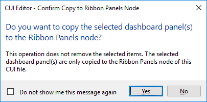- In the CUI Editor - Confirm Copy to Ribbon Panels Node dialog box, click Yes.
