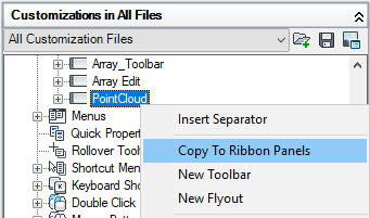 - Right-click the toolbar that you want to copy and convert to a ribbon panel. Click Copy to Ribbon Panels.