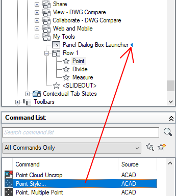 - Drag a command from the Command list to Panel Dialog Box Launcher on the panel.