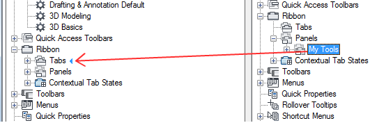 <file name> pane on the right side to the Panels node of a loaded CUIx file in the Customizations In