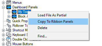 - Right-click over the dashboard panel you want to copy and convert to a ribbon panel. Click Copy to Ribbon Panels.